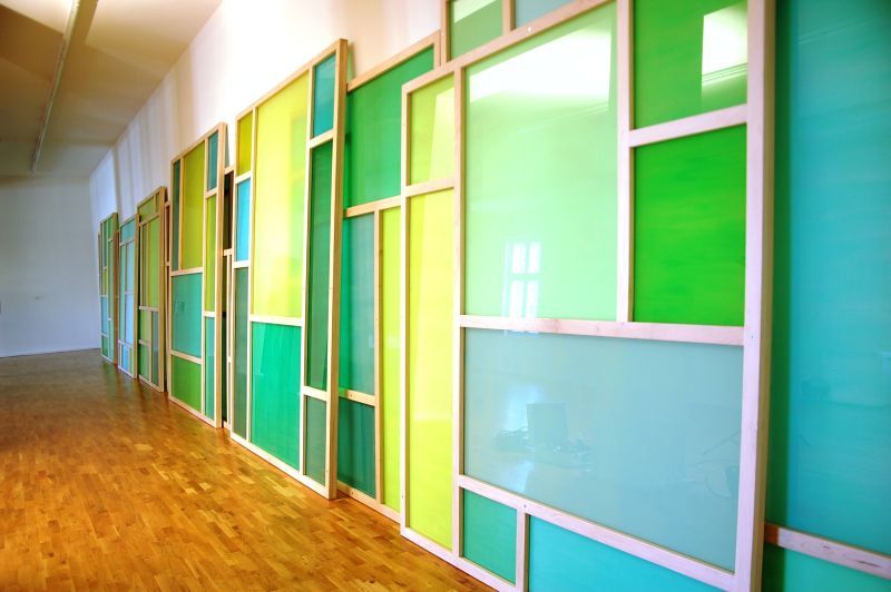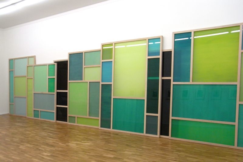 Glass coloured with acrylic paint, wood